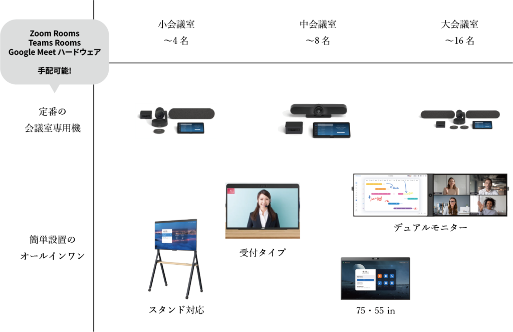 近年のハイブリッド会議システムは、Zoom Rooms、Teams Rooms、Google Meet ハードウェア、LoopGateともに、会議室のサイズに合ったパッケージ化のご提案が進んでおります。パッケージ化は各社のノウハウ蓄積につながり、お客様の満足度を最大化するベストプラクティスのご提案、スピード感のある工事・納品、導入コストの抑制、高品質サポートにつながります。