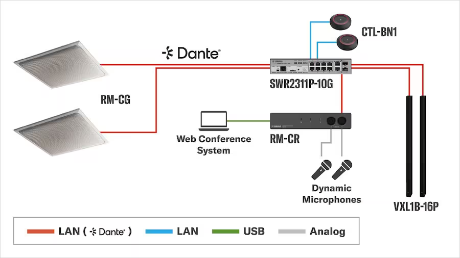シーリングアレイマイクロフォン (RM-CG) + ラインアレイスピーカ(VXL1B-16P)